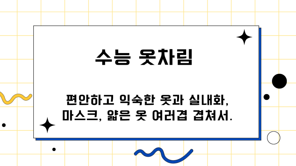 필수 수능 준비물 편 마지막으로 수능 옷차림에 대해서 알려드리겠습니다. 수능 옷차림으로는 시험을 볼 때 부담스럽지 않은 편안하고 익숙한 옷과 실내화를 착용하는 것을 추천 드립니다. 평소에 학교에서 입던 교복이나 생활복, 체육복이 편하고 불편하지 않다면 수능 옷차림으로 적절합니다. 그리고 시험장에서 마스크 착용은 필수이니 평소에도 계속 마스크를 착용해서 마스크 착용이 불편하지 않도록 익숙해지는 것이 좋습니다. 또한 시험장 당일은 날씨가 춥지만 실내는 난방을 세게 틀어서 더울 수 있으니 수능 옷차림으로는 얇은 옷을 여러 겹 걸치고 간 후 수능장 온도에 맞게 입는 것이 중요합니다. 바스락 거리는 소리가 많이 나서 신경이 쓰일 수 있는 옷이나 밥 먹고 난 후 복부에 부담을 주는 옷은 수능 옷차림으로 적합하지 않으니 피하는 것이 좋습니다.