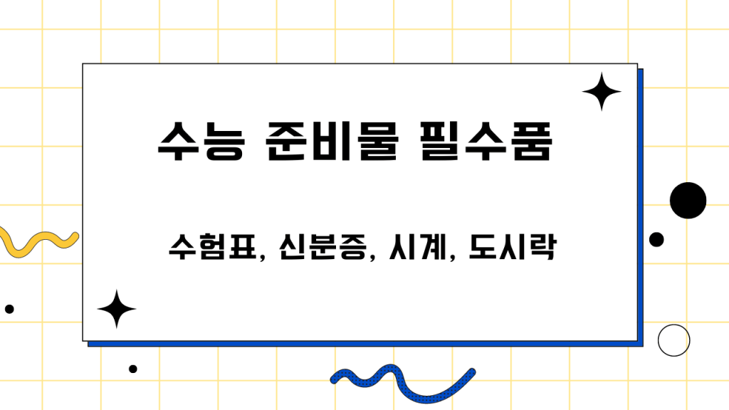 먼저 수능 당일 수능을 치르기 위한 필수 준비물 리스트를 꼽자면 수능 수험표, 신분증, 수능 시계, 그리고 수능 도시락이 있습니다. 지금부터 하나씩 자세히 살펴 볼까요?