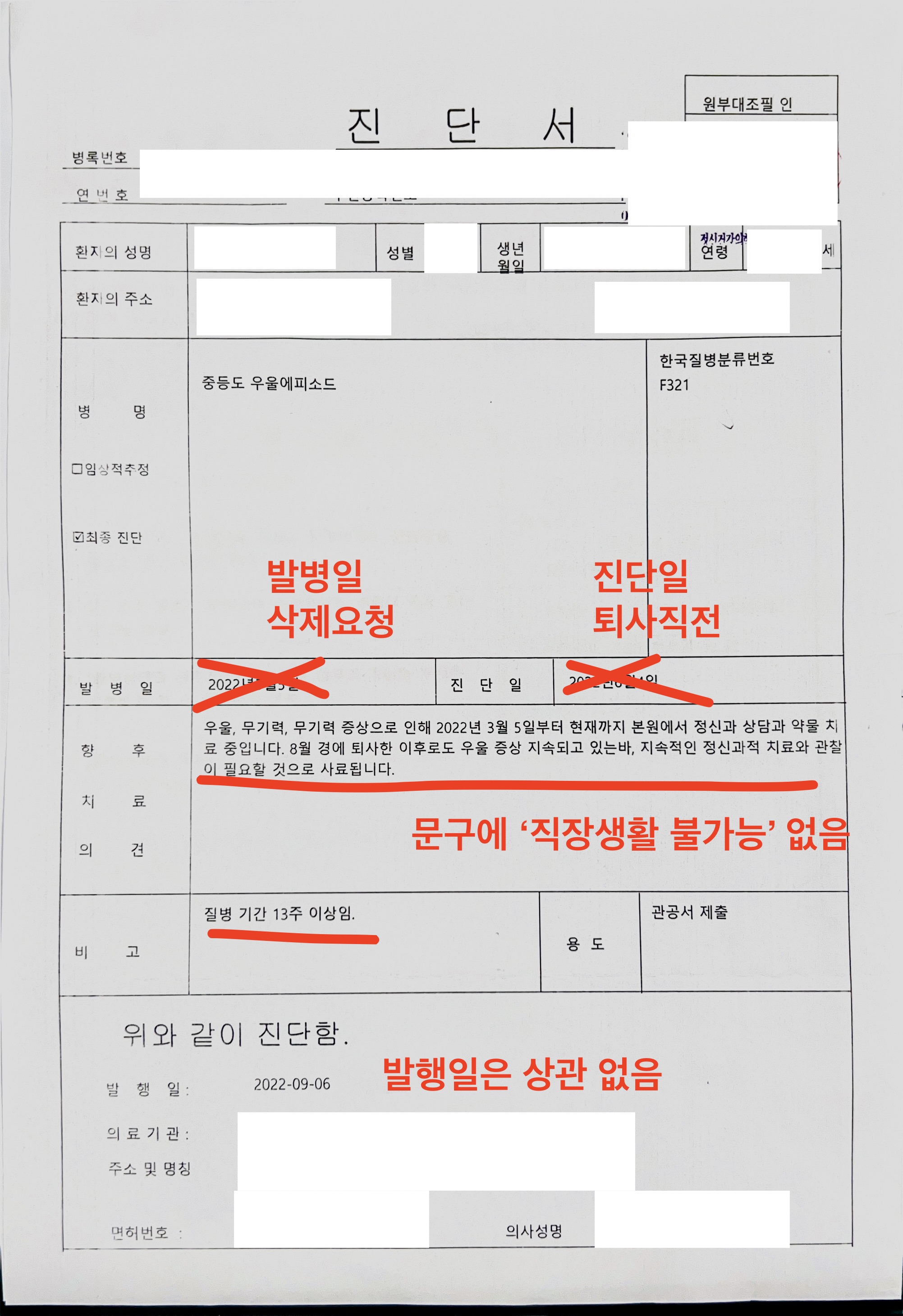 22/06/04로 표기된 진단일을 퇴사 직전으로 변경해 달라고 요청했다.